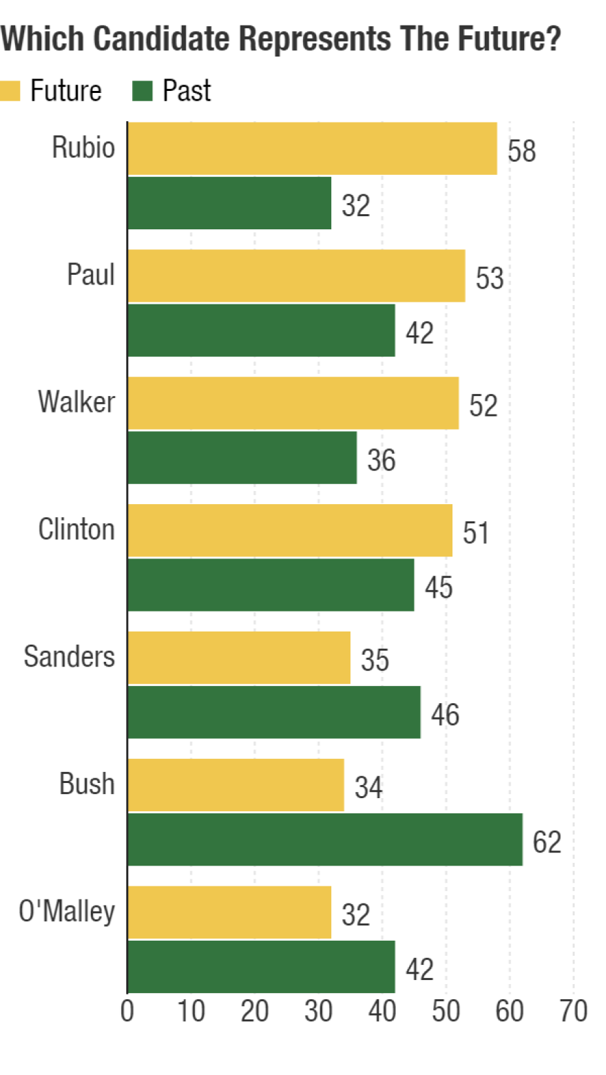 So who does benefit? Rubio, it appears. The Spanish-speaking Florida senator, who just turned 44 on Sunday, leads in the "future" category with 58 percent saying he represents it. He also has climbed to the top of the GOP heap, leading with 14 percent, narrowly ahead of — Bush.