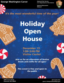 George Washington Carver National Monument will host a holiday open house with seasonal music, arts and crafts, and refreshments.